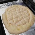 Having said that…I made my circle a bit too thin as the bread should be a bit fluffier. But none theless it was tasty and family approved. Next time I will make it closer to dinner time to enjoy it hot out of the oven. I might play around with some garlic or garlic salt on top of it instead of sesame seeds too. I think it could work well!